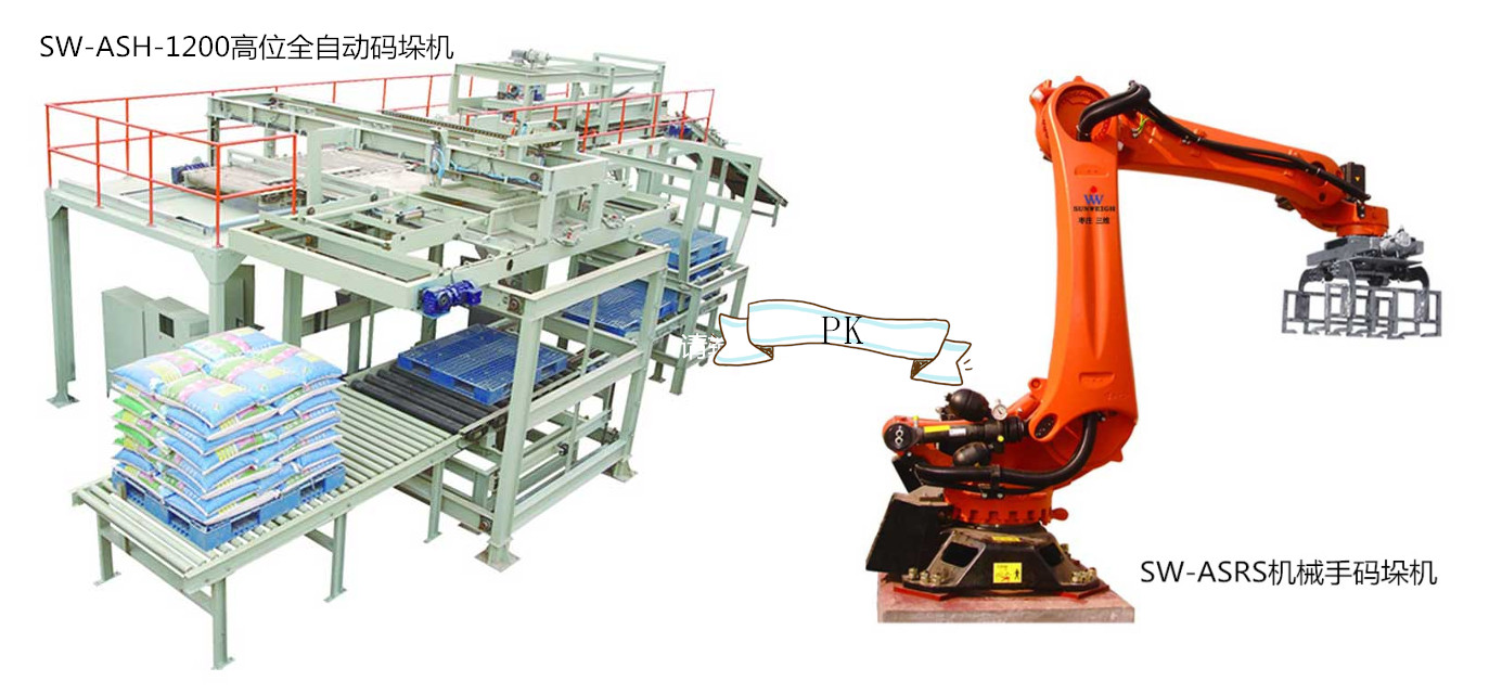 機械手碼垛機眾所周知有如人手一般的裝置,棗莊三維機械手碼垛機SW-ASRS主要由壓平整理、緩沖輸送機、抓取輥道、托盤機、機械手等裝置組成。整個碼垛的過程首先由輸送機將合格的包裝袋輸送到整平機進行壓袋整平,使袋形平整,包裝袋到達抓取輥道后機械手檢測到來袋的包裝袋對其進行抓取、轉(zhuǎn)向、堆放、分層進行碼放,從而完成整個碼垛工序。而它像人手一般的機械手裝置有一個缺點,如果來袋的包裝袋袋型不夠整齊會導(dǎo)致抓袋時將包裝袋抓破。因為機械手結(jié)構(gòu)簡單安裝方便前期投入少、可同時碼垛不同規(guī)格型號的來料成品,也滿足3條輸送線來料的碼垛需求的特點,所以上市以來倍受眾多客戶的青睞。而棗莊三維不但有機械手這個結(jié)構(gòu)小巧安裝簡單的碼垛機外,還有一款不會將包裝袋抓破的全自動碼垛機SW-ASH-1200高位全自動碼垛機,顧名思義高位碼垛機安裝高度相對機械手碼垛機來說要高出許多,而且高位全自動碼垛機只能碼垛一種規(guī)格一條輸送線來料的成品碼垛需求,而且相對機械手而言前期投入成本多出接近10倍,所以客戶一般都很少關(guān)注。但是高位碼垛機碼垛速度能達到1600包/小時,垛型整齊美觀牢固,是較傳統(tǒng)的人工碼垛效率高,這是機械手無法比擬的,而且所有包裝袋的袋口朝里,可實現(xiàn)自動編組分層。而機械手一般可碼垛800包/小時,雙手的可達到1000包/小時的碼垛速度;一般的機械手碼垛機可用6-8年,而高位全自動碼垛機可使用100年,使用壽命高出12倍還多;高位碼垛機可在任何地區(qū)使用,而機械手碼垛機不能在高原地區(qū)使用,多用于北方地區(qū);機械手碼垛機每年會產(chǎn)生1-3W的保養(yǎng)維護費,而這項費用高位碼垛機沒有,長期以往節(jié)省不少開支。